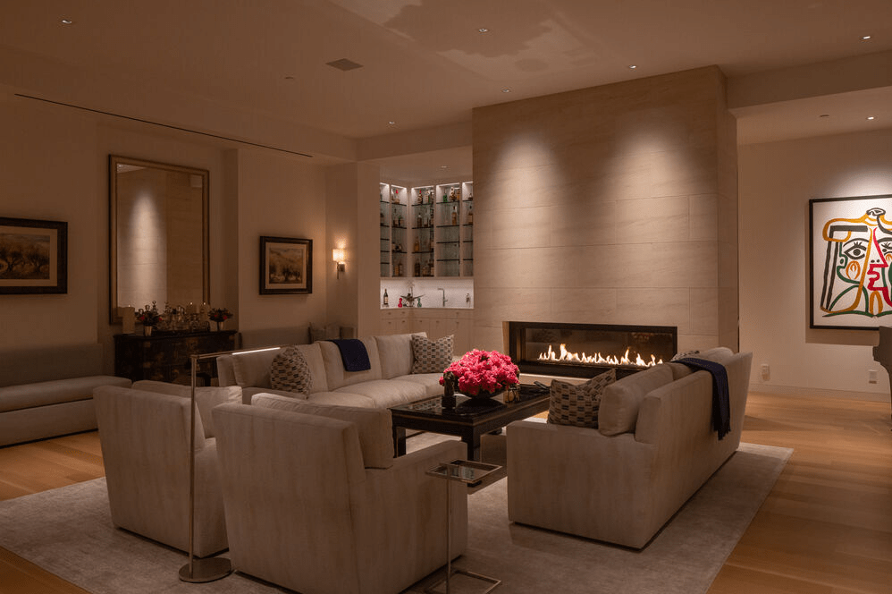 Beyond a gated drive and custom steel-framed doors, approximately 15,700 square feet of refined living space unfolds. Rare rift-sawn white oak flooring, a limestone fireplace and oversized custom windows bring warmth, texture and abundant natural light throughout.