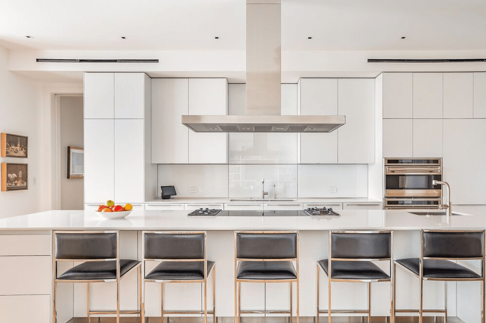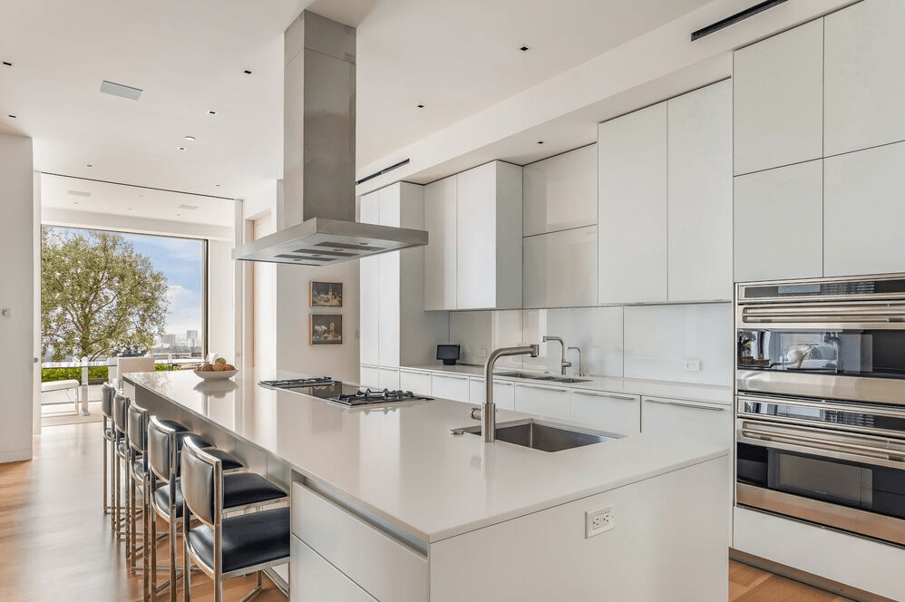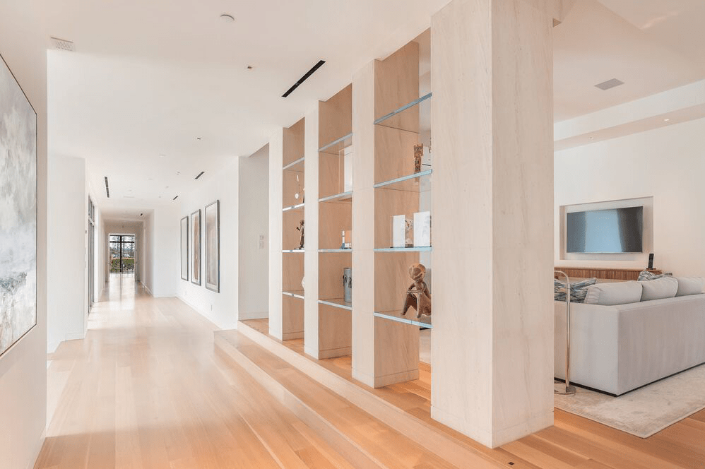 The Bulthaup kitchen is fully equipped with Gaggenau appliances, while a Crestron-controlled environment seamlessly manages the home’s audio system. A climate-controlled wine room, with display shelving for up to 640 bottles, doubles as both a collector’s showcase and a striking architectural centrepiece.
